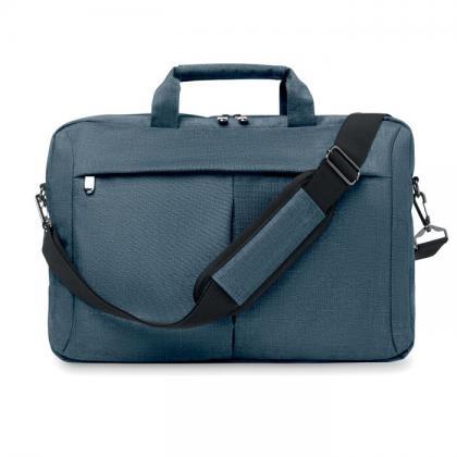 Laptop bag in 360D 2 tone polyester including one main internal compartment for 15 inch laptop and one zippered front pocket. Includes detachable and adjustable shoulder strap. Trolley holder on back side.