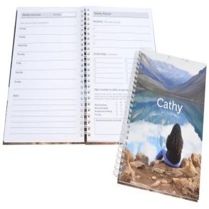 Reflection Journal containing 1 x 170gsm insert printed full colour both sides, 52 sheets white paper from a sustainable source with a weekly planner design. 1750 micron gloss laminated hardbacked cover. Full colour print to front & back cover. Inner front cover has ...a printed lining sheet. Wiro bound along the left hand side with white wire. Bulk packed. (FSC mix70%) INT-COC-002541